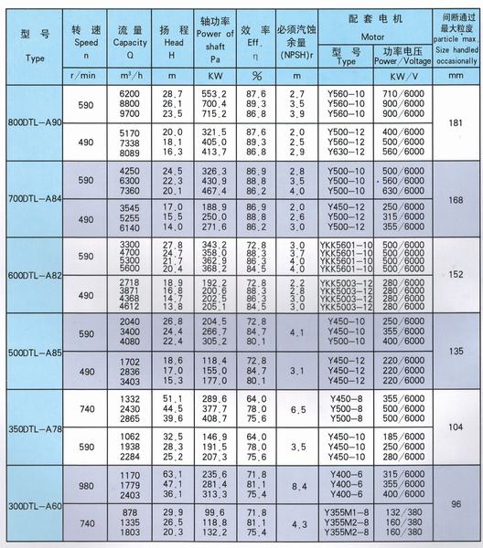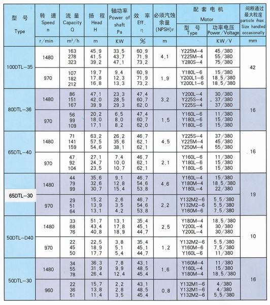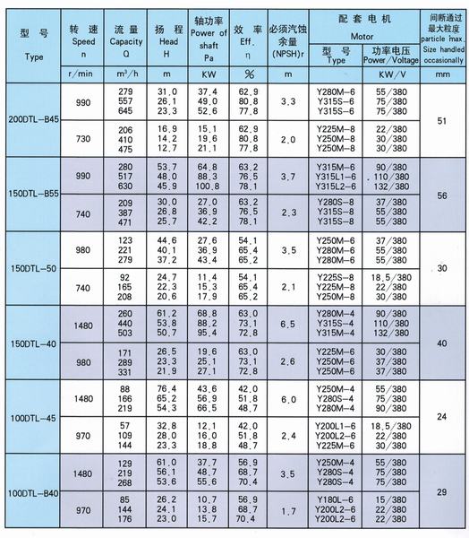 DTL系列脫硫泵為軸向吸入 、單級單吸、托架(懸架)離心式結構。該系列泵在水力設計、結構設計以及鑄件所用材料上,綜合應用了國內外同類產品的優點并加以創新。具有高效節能、抗腐耐磨、振動小、噪聲低、運行可靠、使用壽命長、維修方便等特點,泵的綜合性能居國內領先水平?蓮V泛用于火電、煉鋁和煉油等行業的脫硫系統輸送石灰或石膏漿液。漿液中氯離子含量最高可達60000ppm,漿液的ph值允許在2.5—13之間,漿液溫度≤65℃,漿液重量濃度CW最高可達60%。